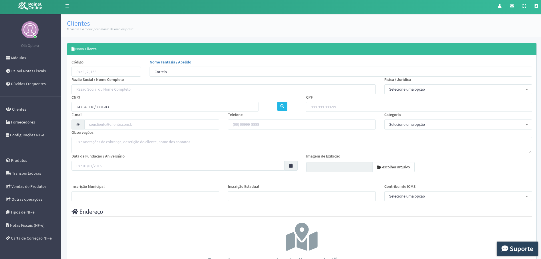 1️⃣ Acesse o menu desejado (Clientes, Fornecedores ou Transportadoras).