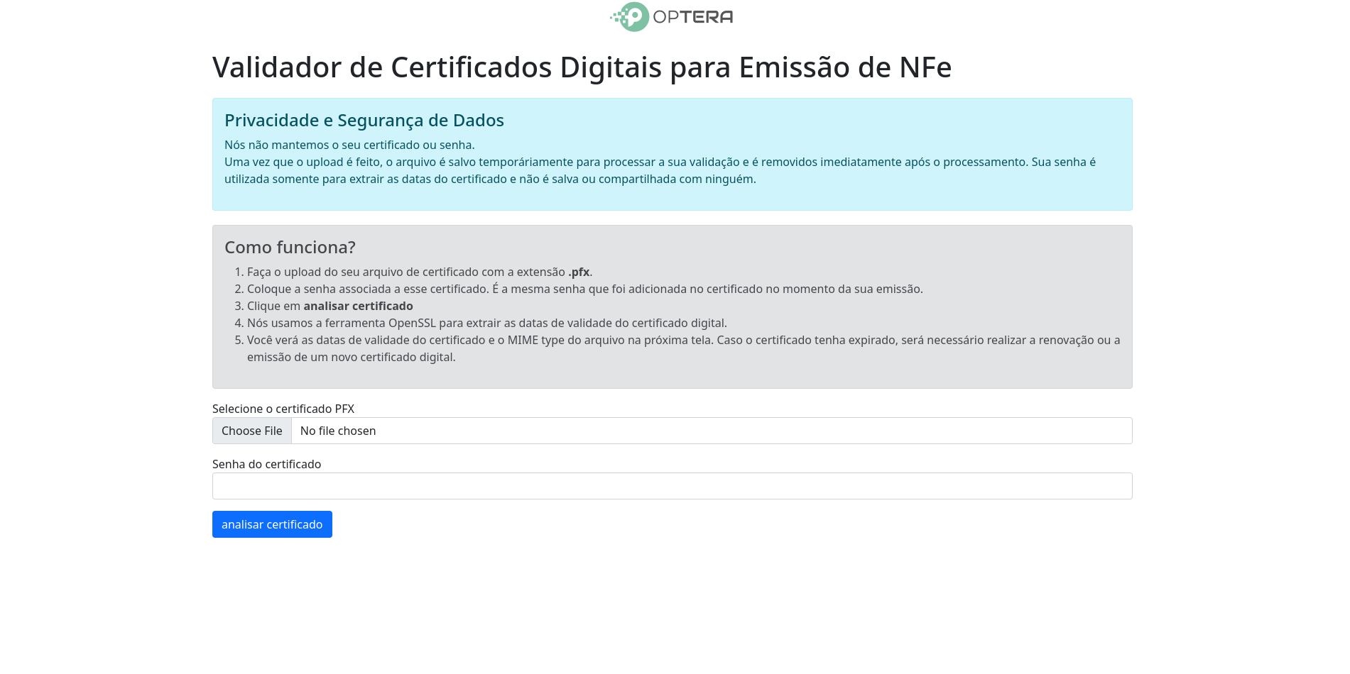 Acesse o nosso validador de certificado digital (https://validacertificado.optera.com.br) para verificar a validade do seu certificado