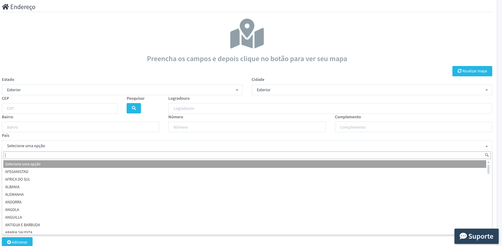 - País (Para poder selecionar um País é necessário selecionar o Estado e a Cidade com a opção "Exterior")