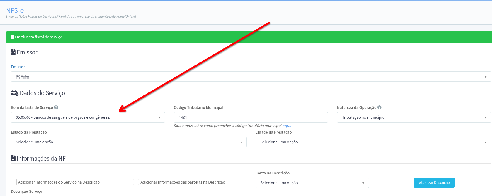 Na tela da NFS-e, localize o campo Item da lista de serviço e verifique qual código você selecionou para o serviço prestado.