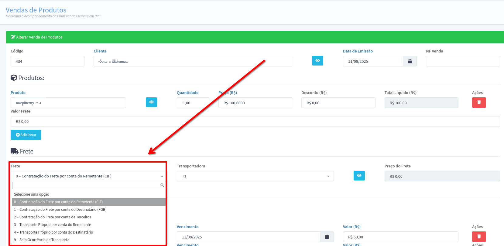 Na venda na qual deseja emitir a NF-e, confira qual modalidade de frete está selecionada.