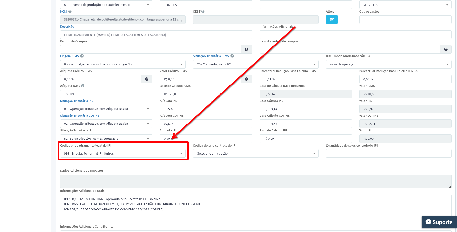 No formulário de emissão de Nota Fiscal, localize onde o campo Situação Tributária IPI foi preenchido.