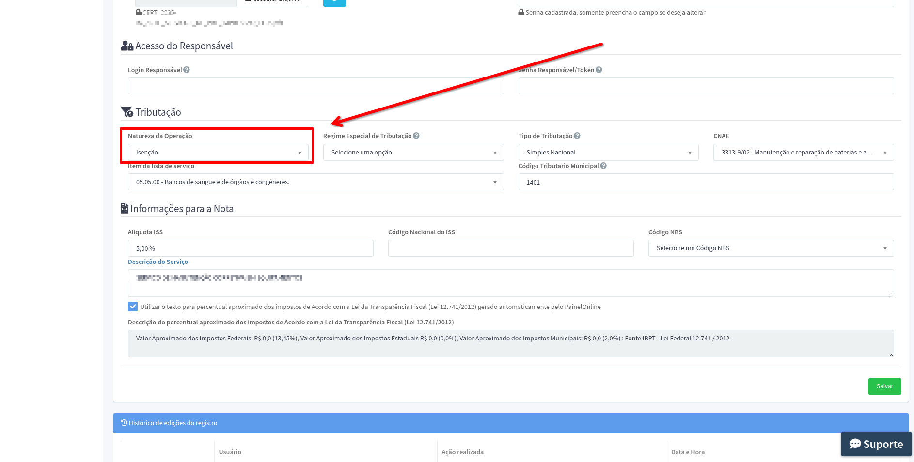 - Se o tomador não estiver cadastrado, altere a opção Natureza da Operação para Isenção.