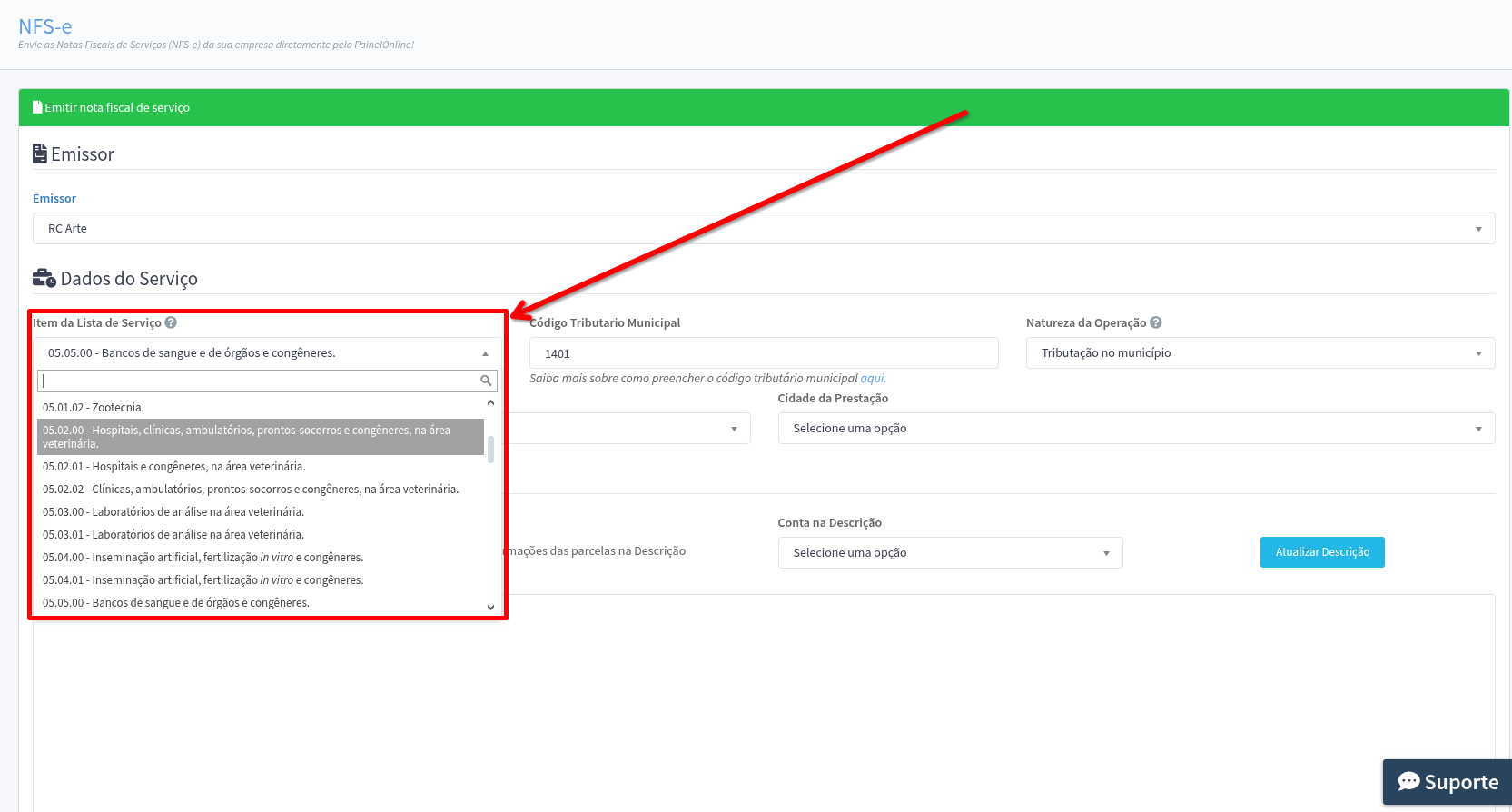 Na tela de emissão da NFS-e, confira o código de serviço informado (ex.: 13.05).