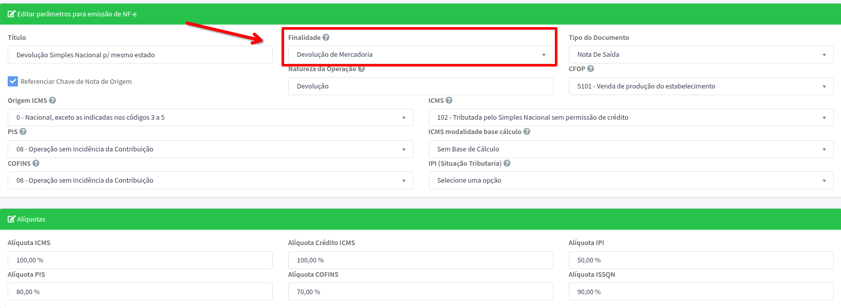 A finalidade da NF-e é informada a partir do parâmetro de emissão selecionado