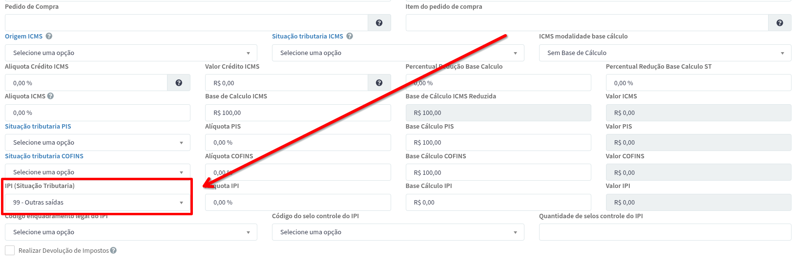 Na tela da NF-e, localize a seção de IPI e confira se o campo de Situação Tributária foi preenchido corretamente e no local adequado.