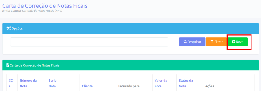 1.Na tela “Carta de Correção NF-e” clique em “Novo”: